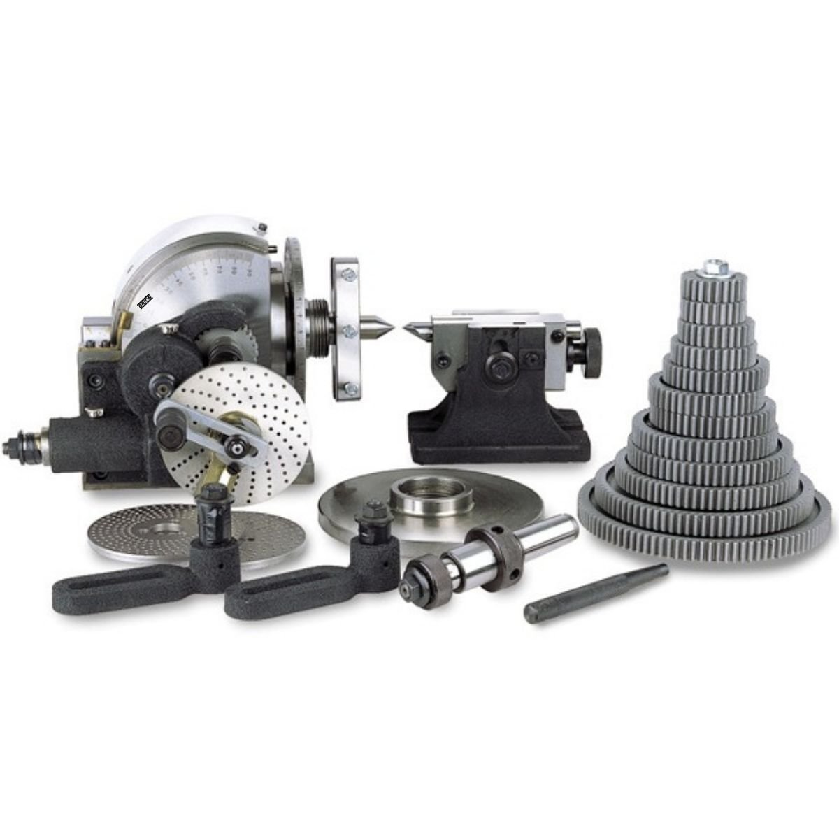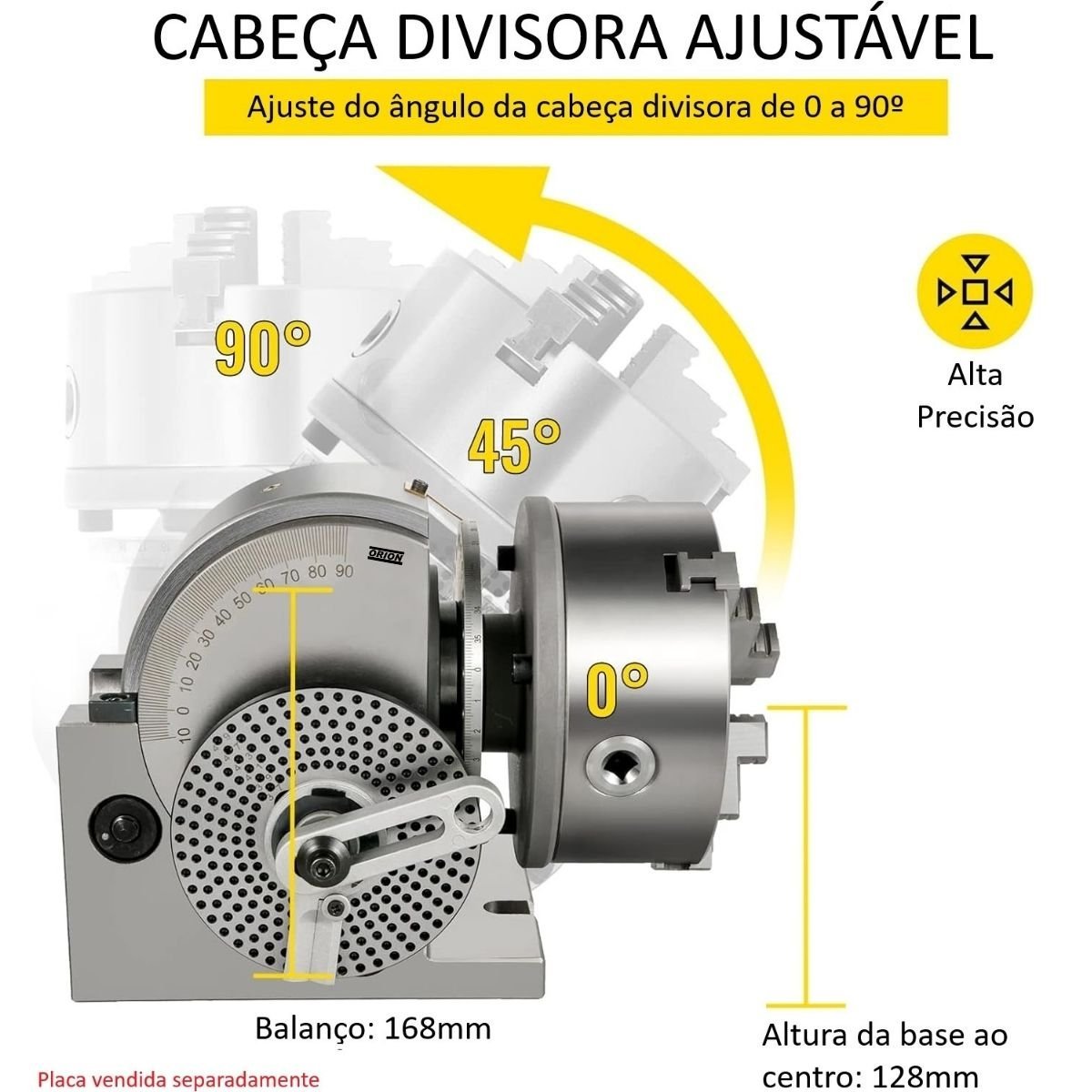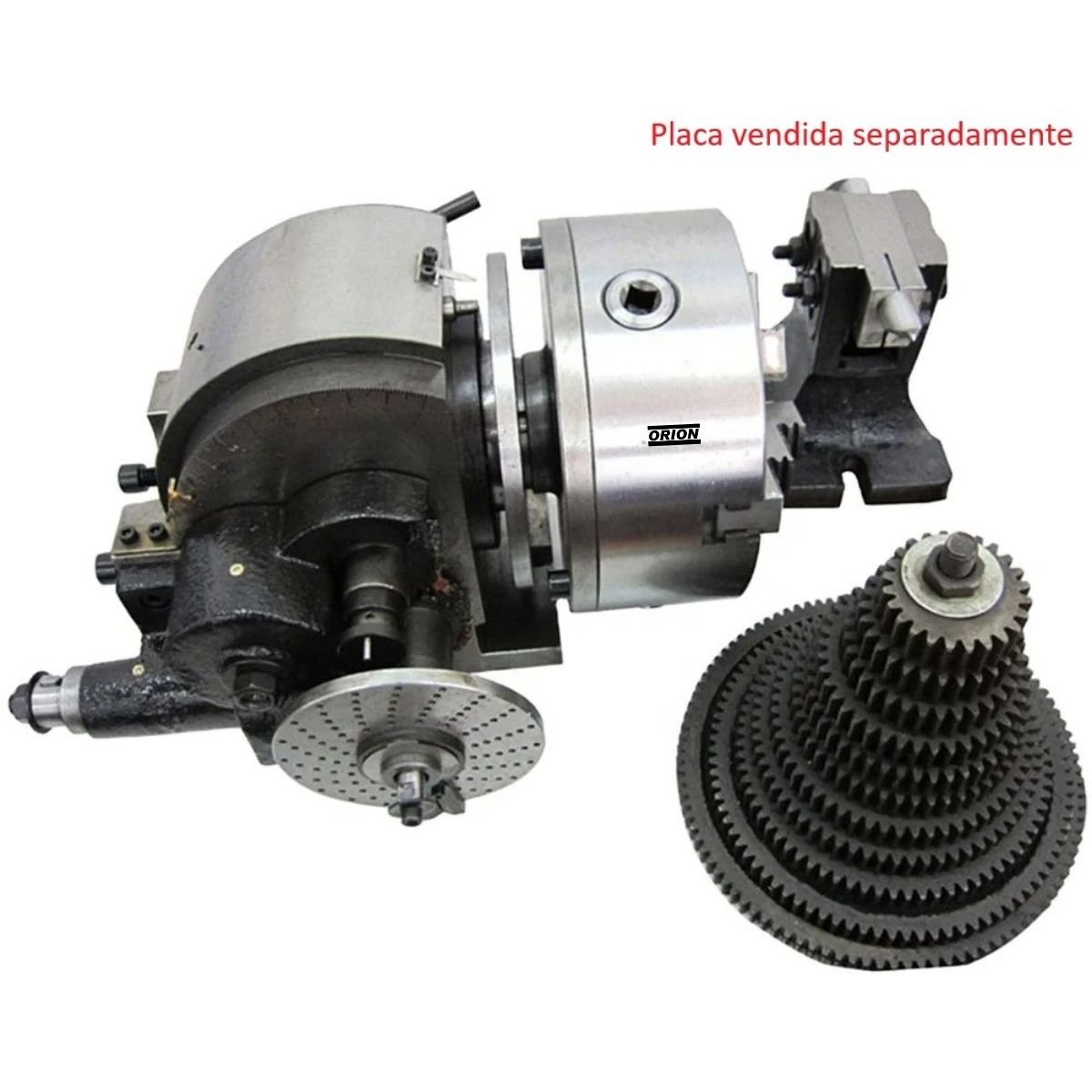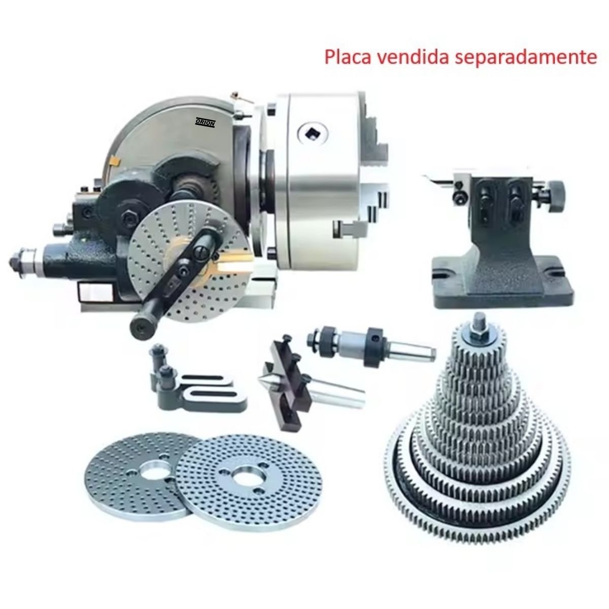 .acompanha: trem de engrenagens, sendo 12 engrenagens: 1. 52 mm. 24 dentes / 2. 52 mm. 24 dentes / 3. 60 mm. 28 dentes / 4. 68 mm. 32 dentes / 5 . 84 mm. 40 dentes / 6. 92 mm. 44 dentes / 7 . 100 mm . 48 dentes / 8. 116 mm. 56 dentes / 9. 132 mm. 64 dentes / 10. 148 mm. 72 dentes / 11. 176 mm. 86 dentes / 12 . 204 mm. 100 dentes – discos divisores – acessórios pertinentes ao giro e funcionamento dos discos – flange para placa 160 ou 200 mm.