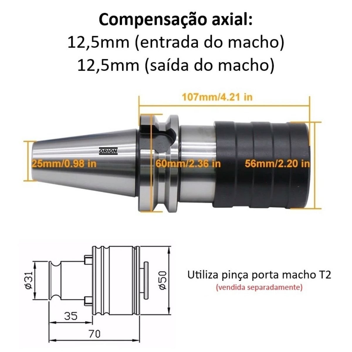 .compensação axial: 12,5mm (entrada do macho) e 12,5mm (saída do macho) que evita quebra de macho.