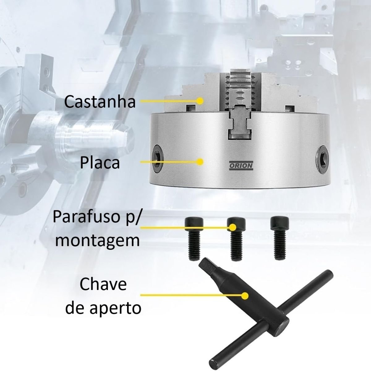 .placa de torno reversível: castanha reversível, com fixação por parafuso na castanha base. A reversão ocorre conforme necessidade da fixação de peças internas ou externas;